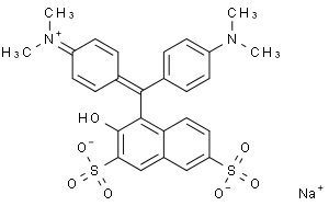[Na+].CN(C1=CC=C(C(C2=C(O)C(S([O-])(=O)=O)=CC3=CC(S([O-])(=O)=O)=CC=C23)=C2C=CC(=[N+](C)C)C=C2)C=C1)C |c:27,t:31|